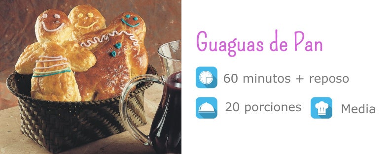 Terminan en punta, los brazos reposan sobre su pecho y sus manos sostienen un ramillete de flores. Estas fieles acompañantes de la Colada Morada son panes dulces en forma de figuras o muñecos decoradas alegremente. La palabra guagua, a veces también se dice wawa, significa bebé en Quichua.